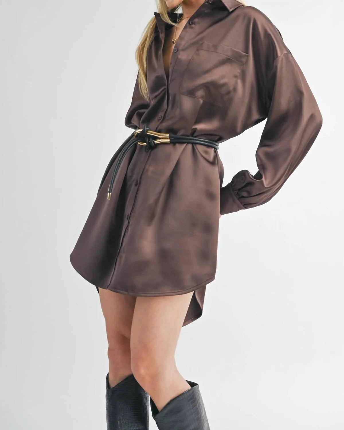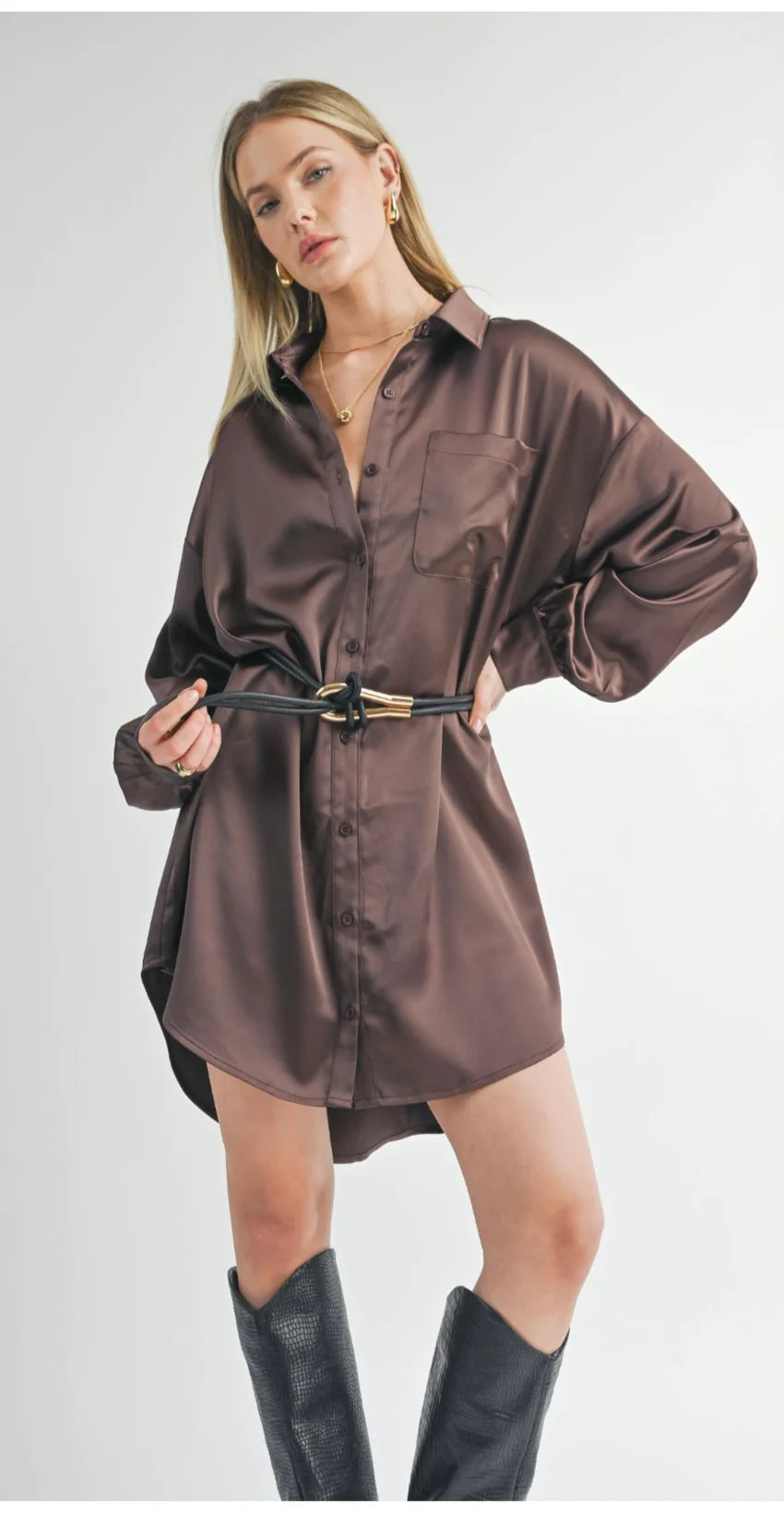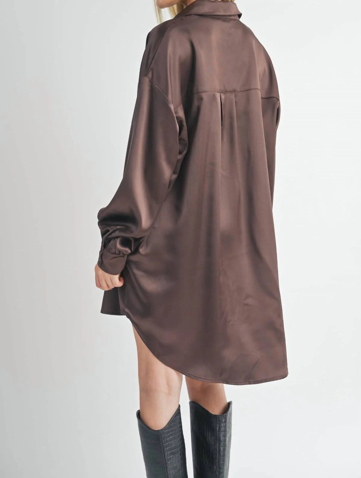 Perfect blend of comfort and sophistication in a rich satin chocolate hue. Featuring a classic collared neckline and convenient button closure. Designed with an oversized fit. Includes a playful front pocket and button cuffs. Ideal for a laid-back yet chic look